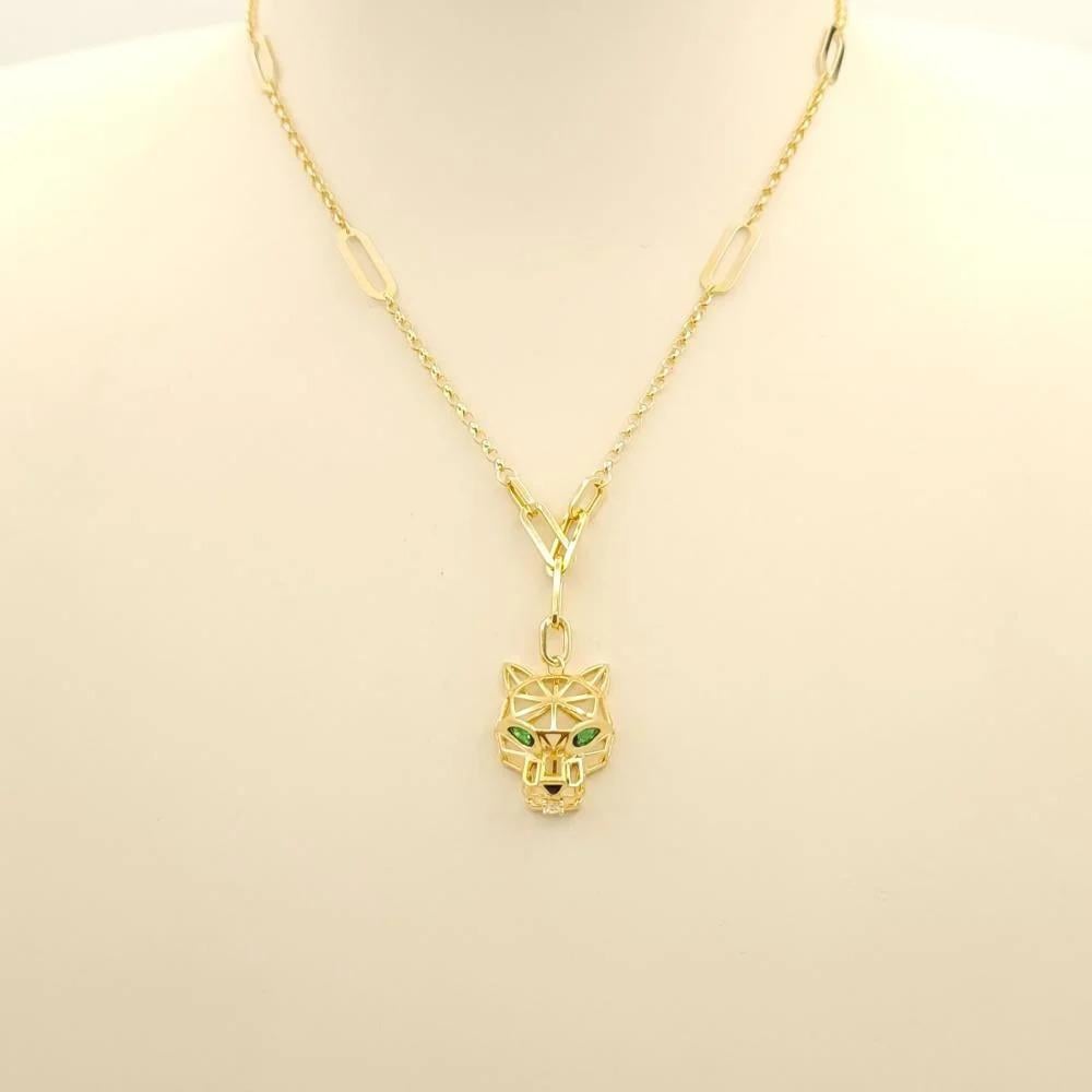 صُممت القلادة لتحاكي روعة وحيوية نمر البانثر، حيث تتخذ شكلًا رشيقًا يلتف حول العنق بجمال أخّاذ. صُنعت بحرفية فائقة من الذهب عيار 18، وتُزيّنها أحجار تحاكي تصميم الألماس أو تفاصيل دقيقة تُبرز كل منحنى في التصميم. هذا المزيج من المعدن الثمين واللمسات المتقنة يمنحها بريقًا وحضورًا لا يُنسى.